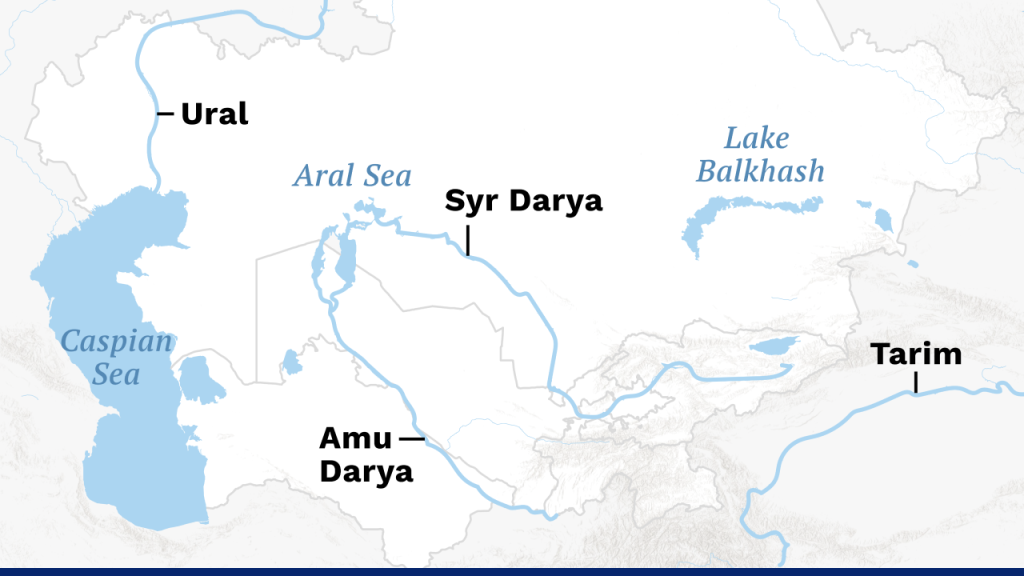 Central Asia showing major rivers including the Amu Darya, Syr Darya, Ural, and Tarim, along with key water bodies like the Aral Sea, Caspian Sea, and Lake Balkhash.