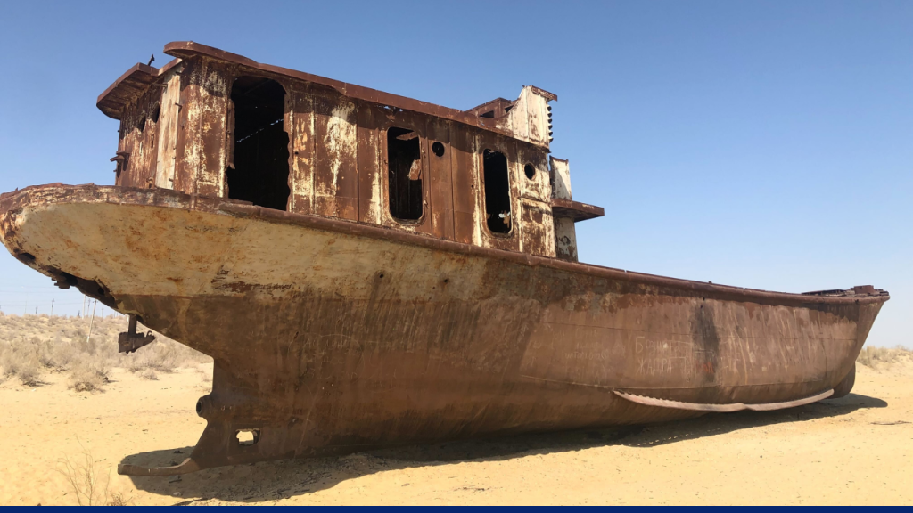 Rusting abandoned ship stranded in the desert of Moynaq, Uzbekistan, once a thriving Aral Sea port, now a symbol of environmental collapse and desertification. Credits: Heidi Koelle